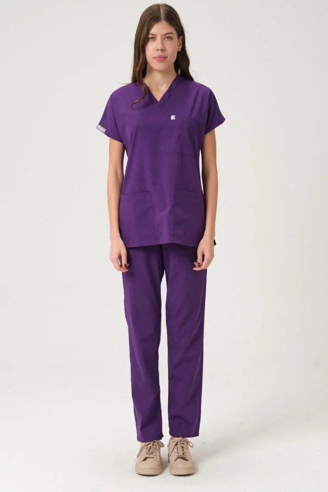 Mor Likralı Scrubs Doktor Hemşire Forması Yarasa Kol Takım Unisex