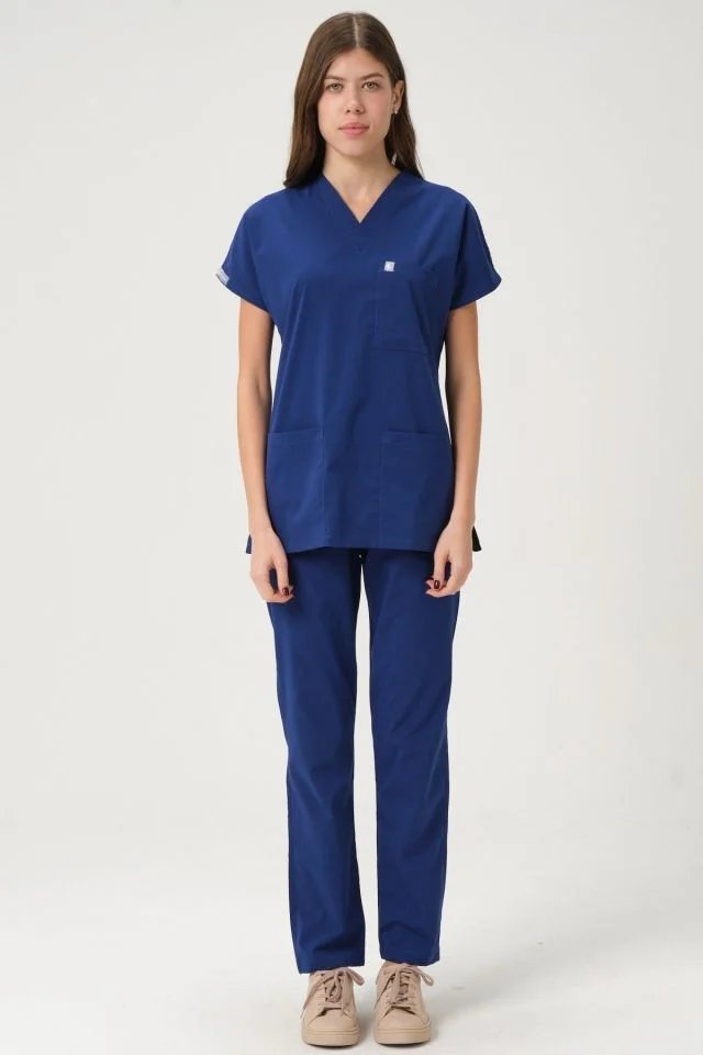 Saks Mavi Likralı Scrubs Doktor Hemşire Forması Yarasa Kol Takım Unisex